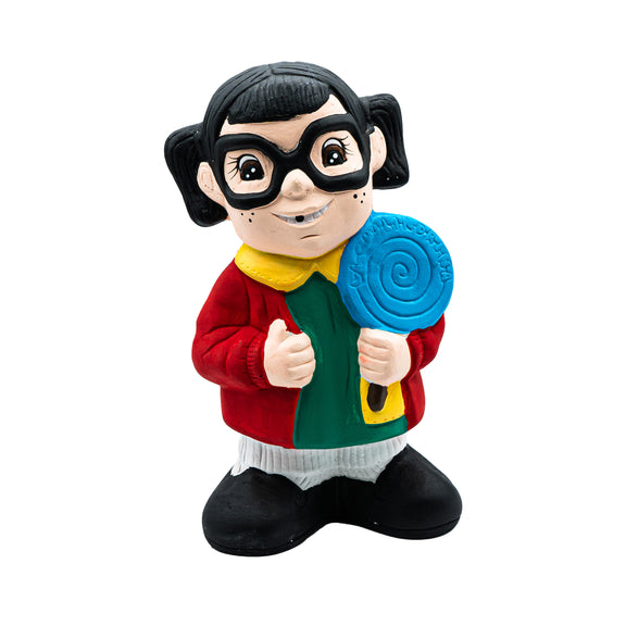 Plaster Bank - Chilindrina 12'' – Savings container featuring the beloved Chilindrina, a classic character from El Chavo del 8. Perfect for fans of the show and collectors of Mexican TV icons. Made of hand-painted plaster with colorful and authentic details.