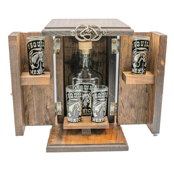 Una elegante barra de madera con un elegante acabado negro que ofrece un toque moderno y rústico. Diseñada con artesanía mexicana, es perfecta para exhibir tequila y crear un auténtico ambiente de cantina.