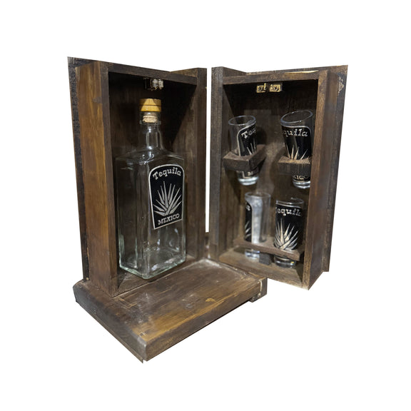 Fabricada en madera tallada, incluye compartimentos para tequila y vasos tequileros.