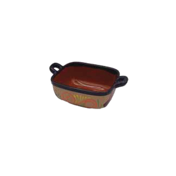 Una pequeña olla rectangular de barro con un rústico acabado arenoso, perfecta para cocinar y servir platillos tradicionales mexicanos. Ideal para darle un toque auténtico a tu cocina o mesa.