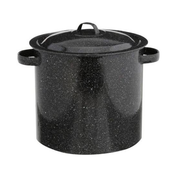 High-capacity, straight-sided pot perfect for making broths, soups, stews, or boiling large portions. Its direct black enamel-coated steel finish lends elegance and resistance to stains and flavors. Suitable for gas, electric stove, and open fire, it offers durability and easy cleaning for everyday or gathering use.