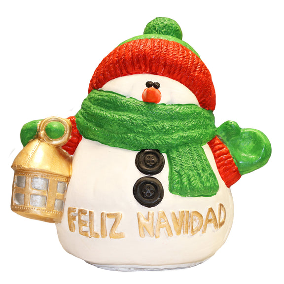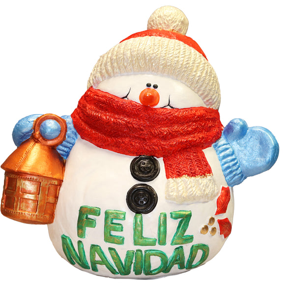 Figura decorativa de muñeco de nieve hecha en yeso con diseño en forma de "V", perfecta para complementar la decoración navideña con un toque artesanal y clásico. Detalles pintados a mano que aportan encanto y calidez a cualquier espacio festivo.