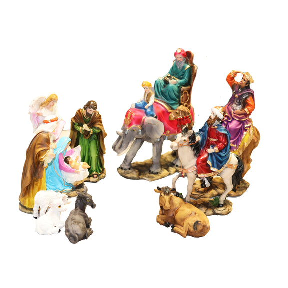 Handcrafted set representing the birth of Jesus, inspired by Hebrew style and adorned with Christmas colors. Each figure is carefully painted with intricate details, making it perfect for decorating homes and religious spaces during the holidays.