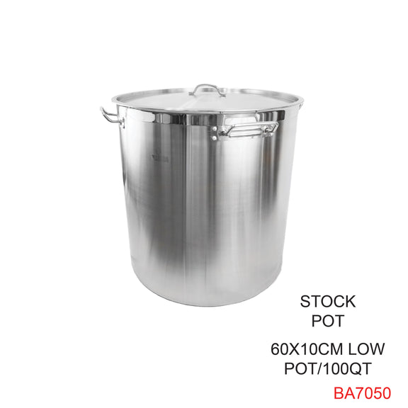 100-quart stainless steel stock pot, perfect for cooking large quantities of food. Ideal for broths, stews, and large-scale recipes. Its sturdy design ensures even heat distribution and long-lasting durability.