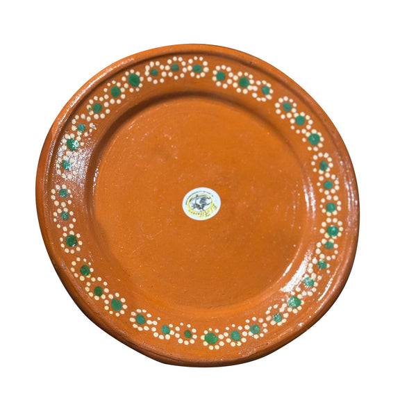 Large round clay dinner plate, handcrafted with natural ceramic and traditional Mexican design. Ideal for serving large portions with a rustic and authentic touch, perfect for family gatherings or special dishes that highlight artisanal tradition.