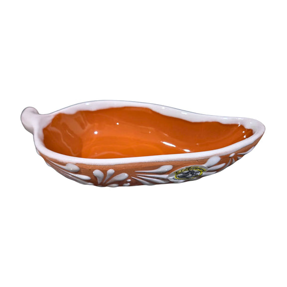 Handcrafted ceramic sauce dish with a chile arenosa design. Perfect for serving sauces, dressings, or condiments at the table, adding a traditional and colorful touch to any meal. Durable and easy to clean.