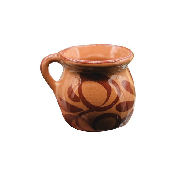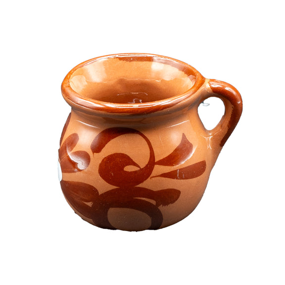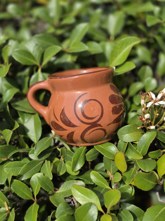 Small Ceramic mug in a traditional Mexican style with a warm coffee-colored finish. Compact size, perfect for espresso or small servings of coffee or tea. Its rustic look adds authentic charm. Great for daily use or as a handcrafted gift.
