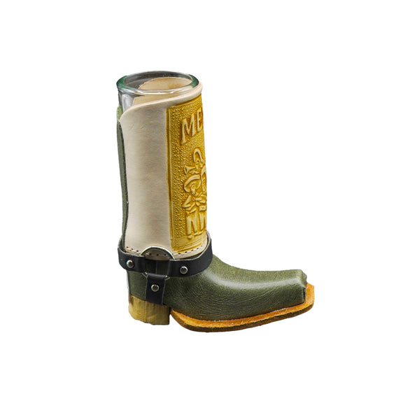 Handcrafted square-boot-shaped tequila shot glass with a fun, rustic design. Perfect for adding personality to your gatherings or celebrations. Great as a decorative item or a unique Mexican gift. Made by hand with traditional charm.