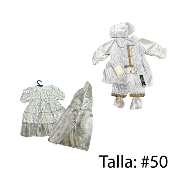 Traditional white attire designed for the Baby Jesus figure, perfect for celebrating Christmas with a touch of purity and solemnity. Made with high-quality materials and decorative details that enhance its elegance.