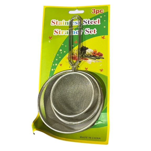 Set of 3 kitchen strainers in various sizes, perfect for washing, straining, or draining food. Made from durable materials and designed for comfortable, efficient use.