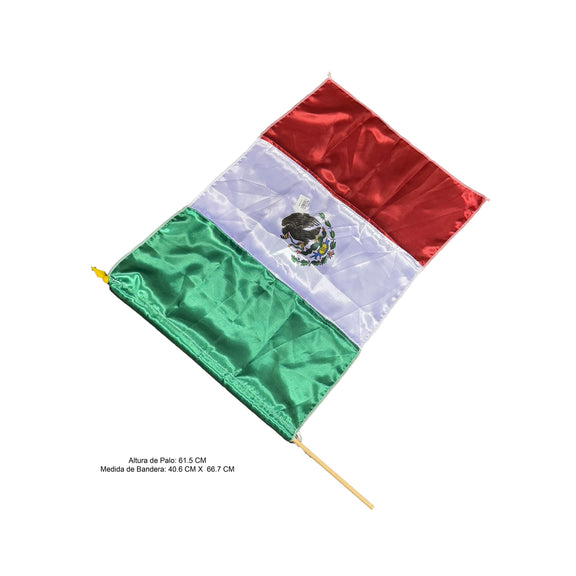 Bandera de México fabricada en tela resistente, tamaño estándar #7. Ideal para exhibiciones patrióticas, decoraciones escolares o eventos cívicos, con colores vivos y duraderos que representan el orgullo nacional.