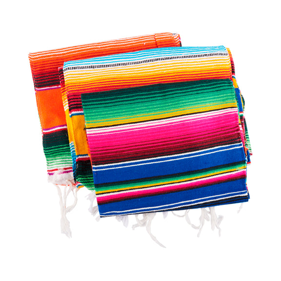 Colorful table runner featuring traditional Mexican sarape design. Adds a festive and cultural touch to any dining setting or celebration.