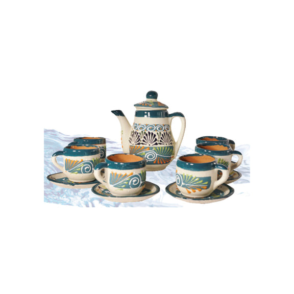 Sandy finish tea set including a teapot and six small cups, perfect for enjoying special moments with traditional style. Handmade in Mexico, its rustic finish and artisanal design bring warmth and authenticity to your table. Durable and easy to clean.