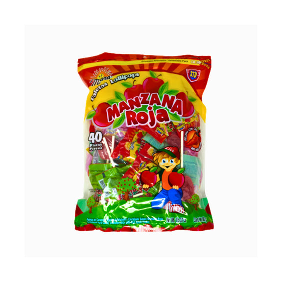 Enjoy the sweet taste of Manzana Roja Rellena lollipops, featuring a fruity apple flavor and a tasty liquid-filled center.