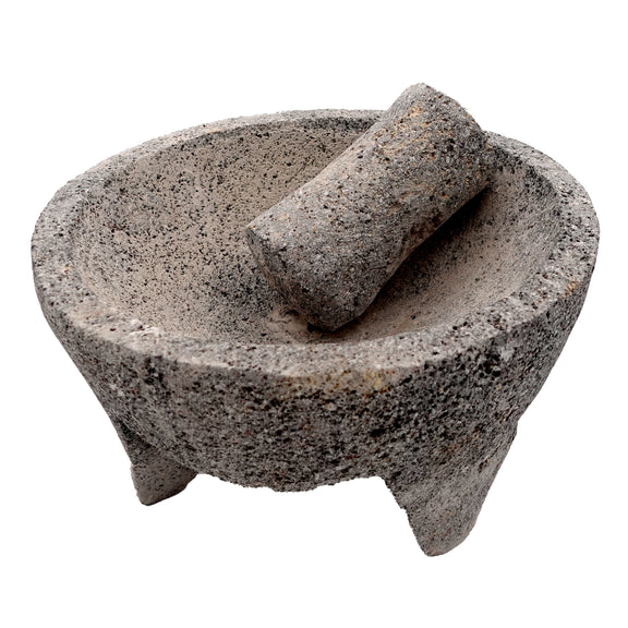 Molcajete tradicional hecho de piedra negra, ideal para moler y preparar salsas, guacamole y otros platillos mexicanos. Su tamaño compacto de 5.5" x 8" lo hace práctico para uso doméstico, ofreciendo durabilidad y autenticidad en cada preparación.