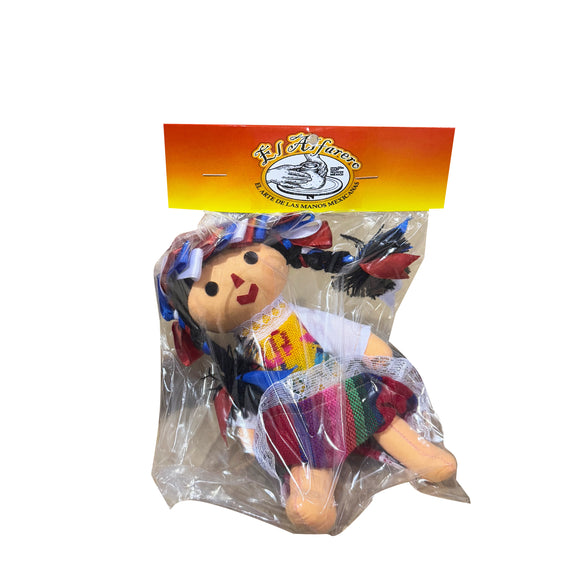 A charming handcrafted doll made from colorful fabric, showcasing vibrant Mexican craftsmanship. The Lele Fabric Doll is perfect as a decorative piece or gift.