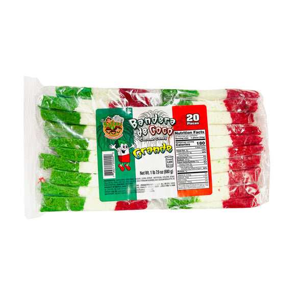 Safari Bandera Coco Grande es un delicioso dulce de coco, presentado en los vibrantes colores de la bandera mexicana. Cada bolsa contiene 1 lb 7.9 oz (680 g) y vienen 18 bolsas por caja. ¡Sabor tropical y colorido en cada bocado!