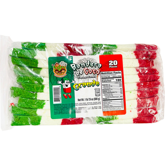Safari Bandera Coco Grande is a delicious coconut treat, presented in the vibrant colors of the Mexican flag. Each bag contains 1 lb 7.9 oz (680 g), with 18 bags per case. Tropical and colorful flavor in every bite!