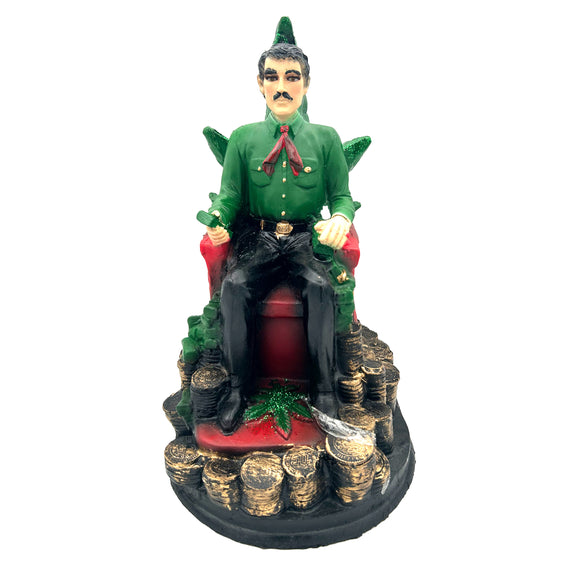 Santo Malverde figure seated on a throne, crafted from resin with carefully painted details. Its #4 size makes it perfect for personal altars, devotional spaces, or as a decorative piece with spiritual significance.