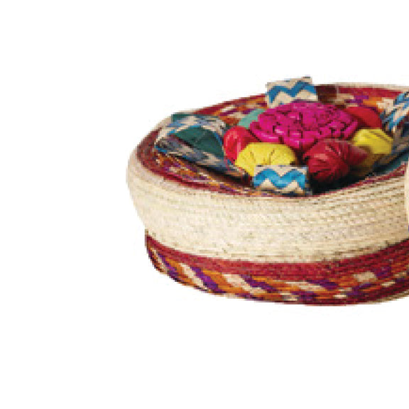 Tortillero artesanal grande elaborado en palma, con un diseño floral intrincado. Perfecto para mantener las tortillas calientes y frescas, añadiendo un toque elegante y tradicional a la mesa en reuniones y eventos especiales.