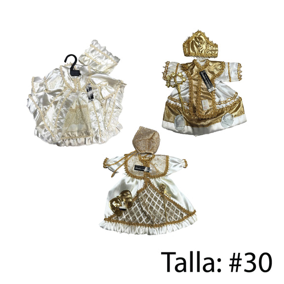 Vestimenta tradicional en color dorado para la figura del Niño Dios, ideal para celebraciones navideñas y eventos religiosos. Confeccionado con materiales de alta calidad y detalles decorativos que reflejan solemnidad y reverencia.